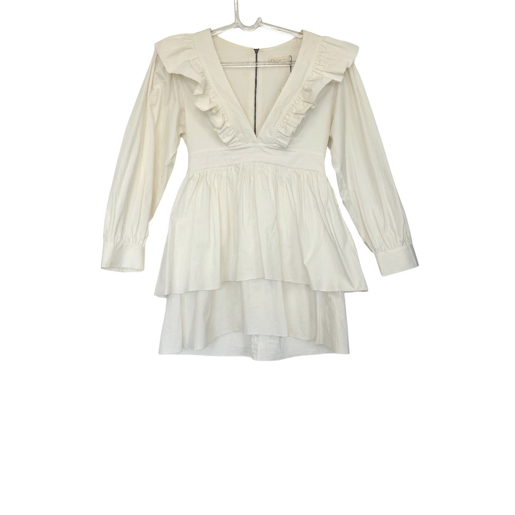 Vestido confeccionado em tricoline, saia com camadas sobrepostas, mangas longas bufantes, decote em V, detalhe de babados e fecho posterior em zíper